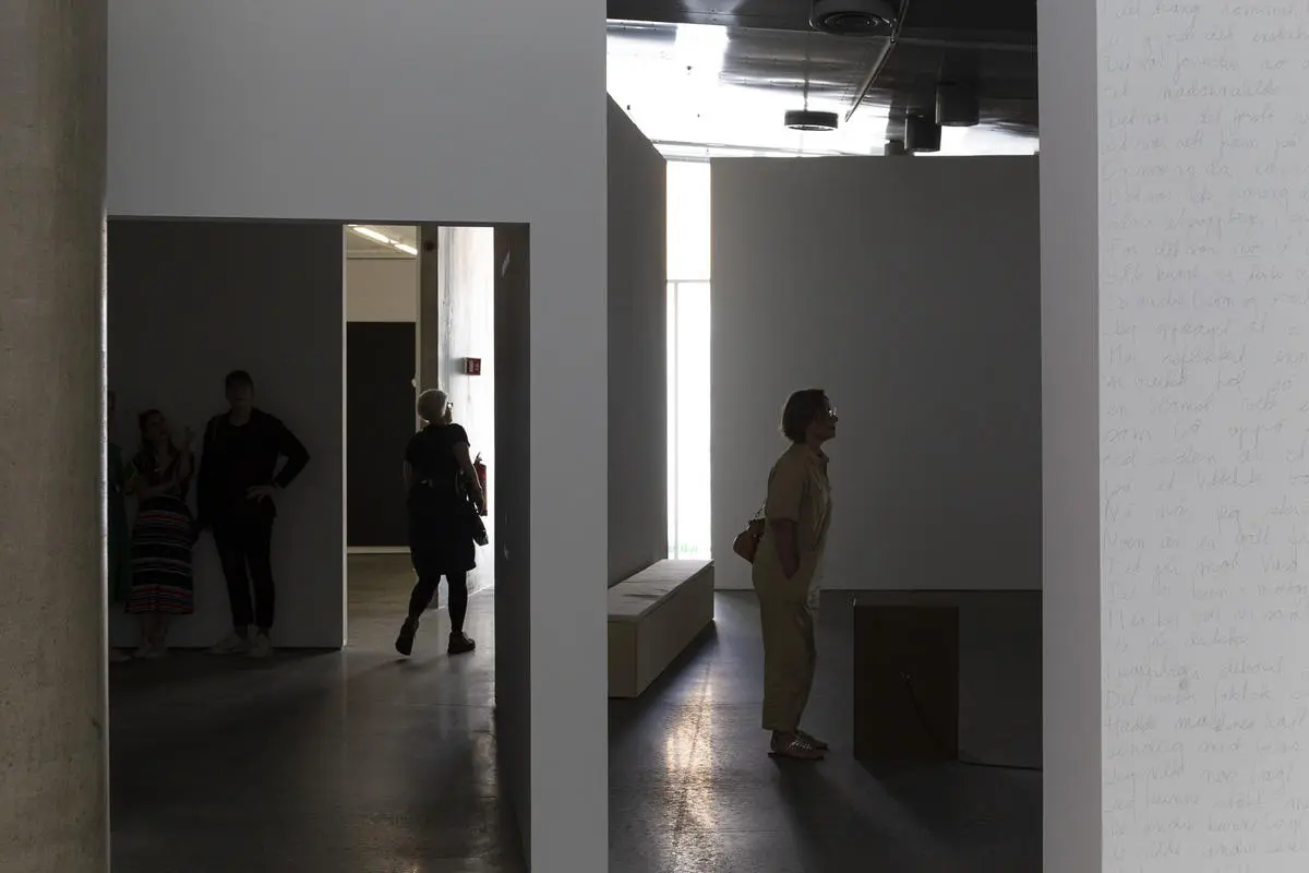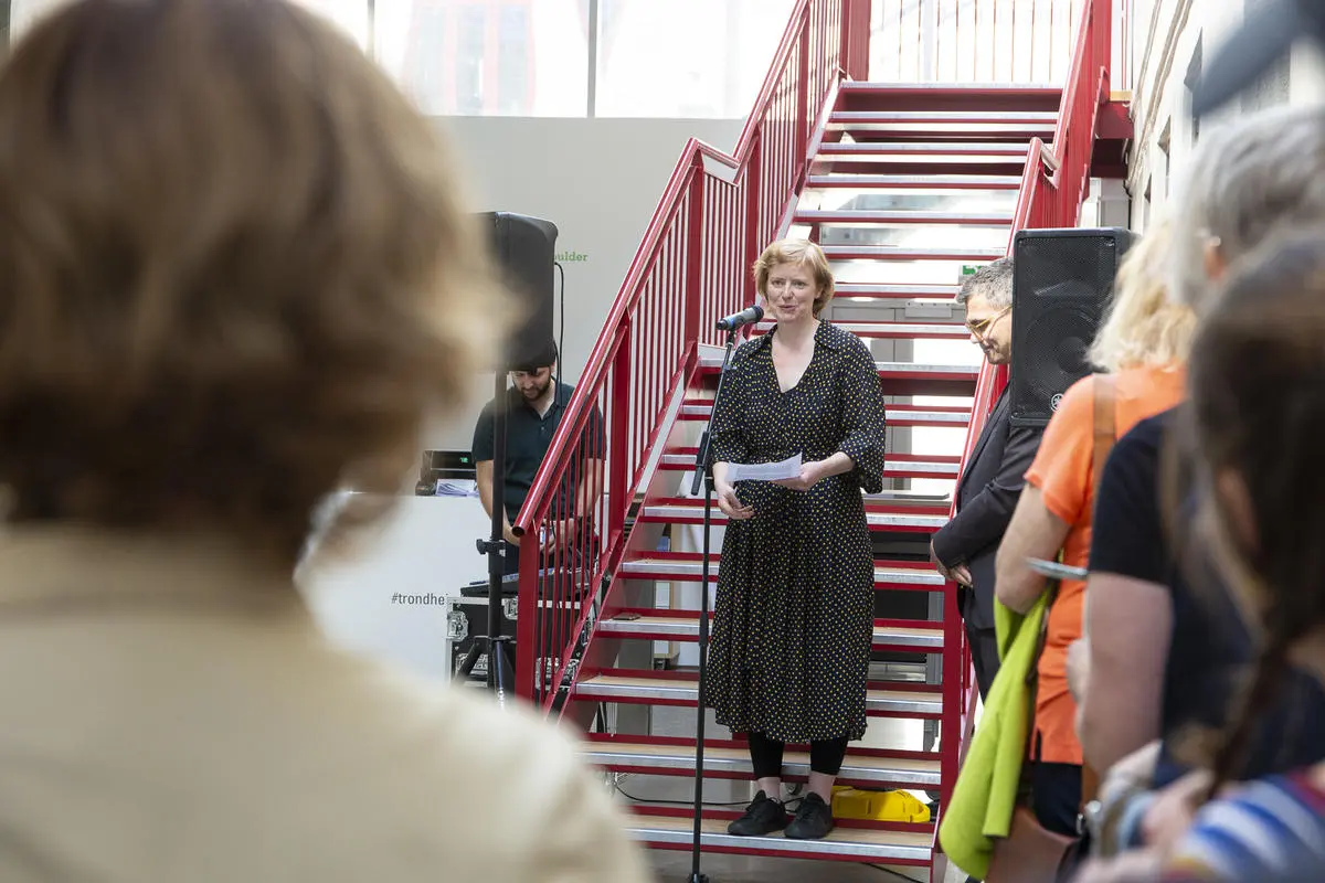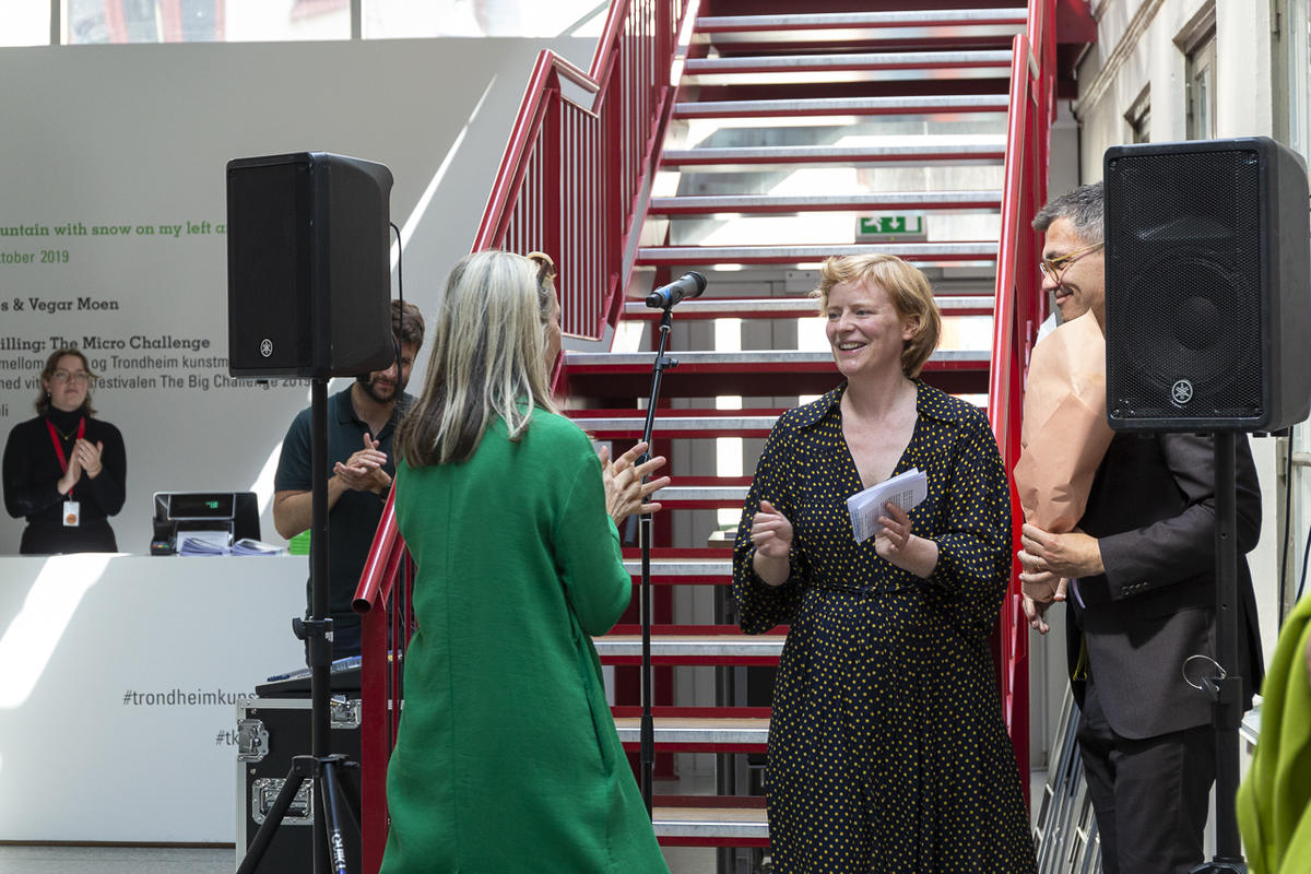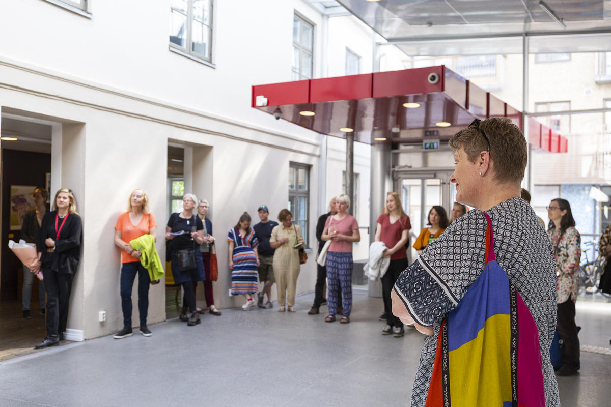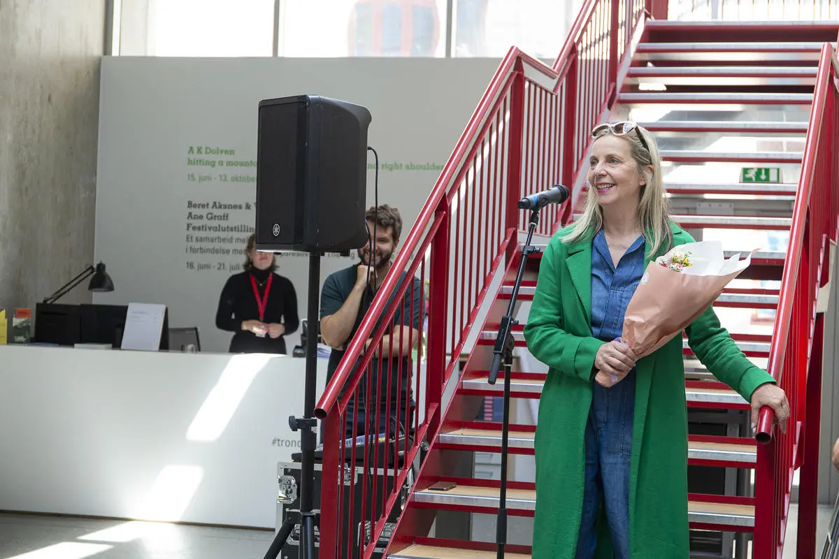 Kurator Randi Thommessen holder omvisning i utstillingen hitting you with snow on my left and right shoulder av A K Dolven på TKM Gråmølna.