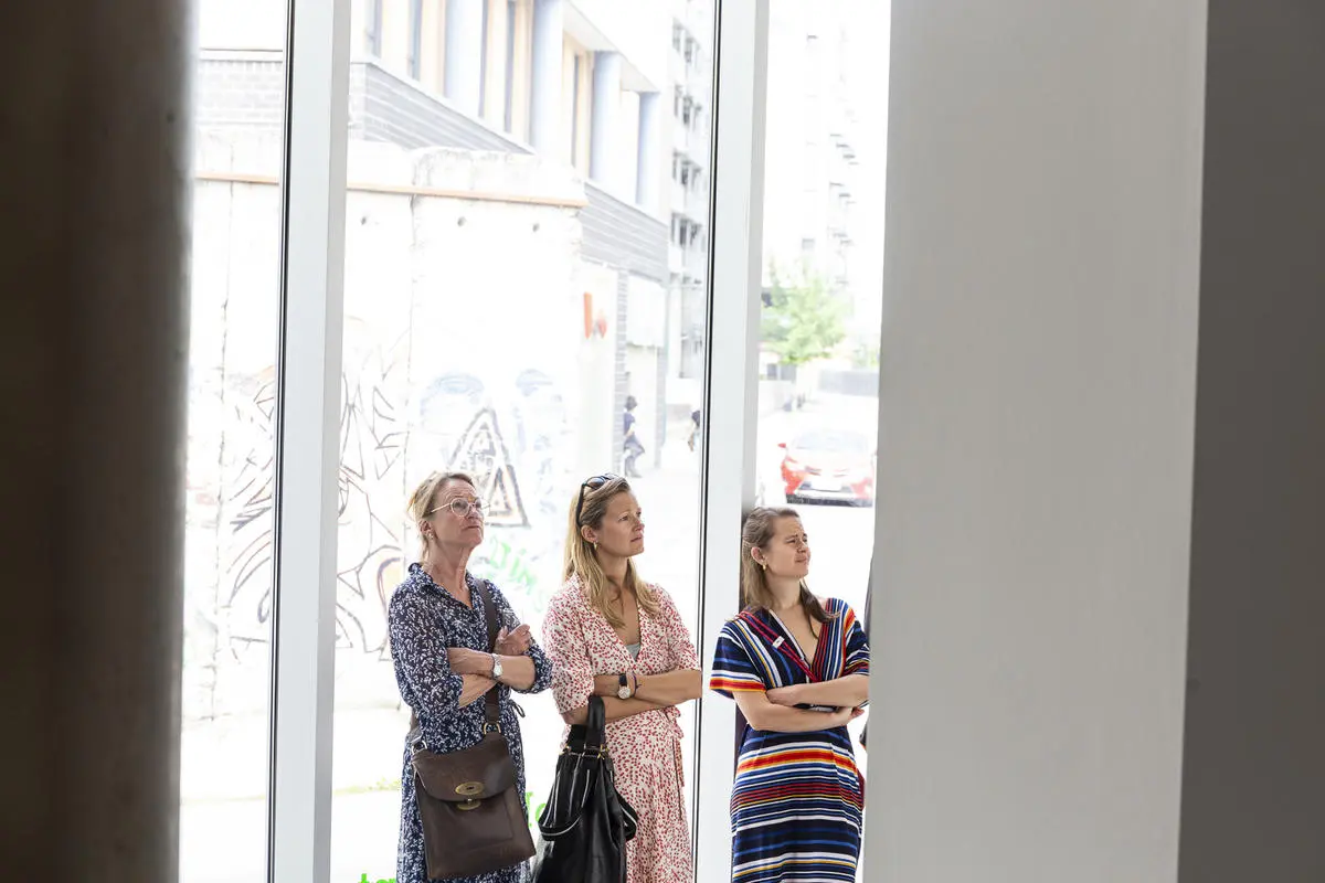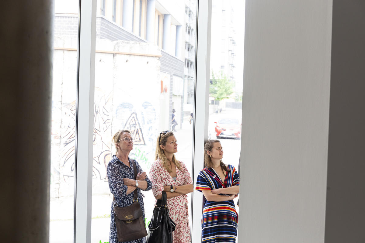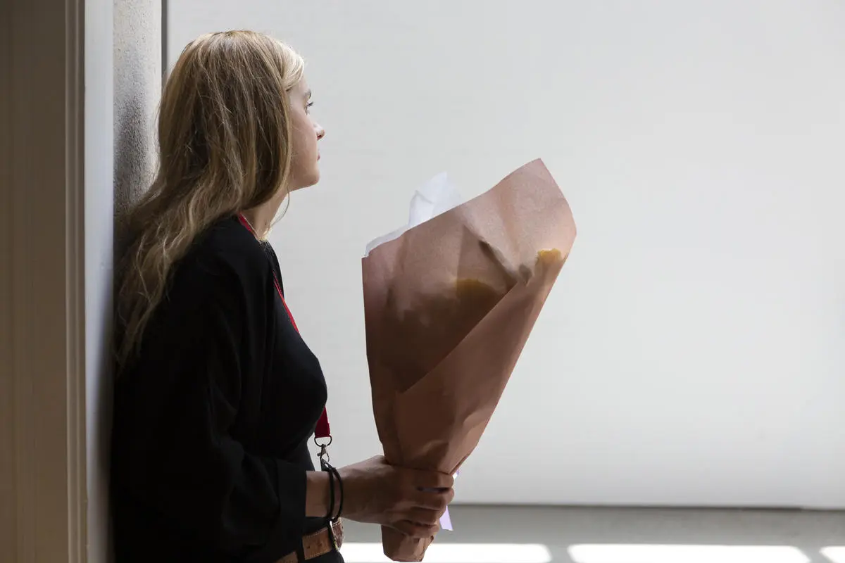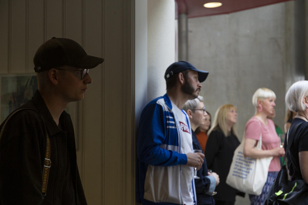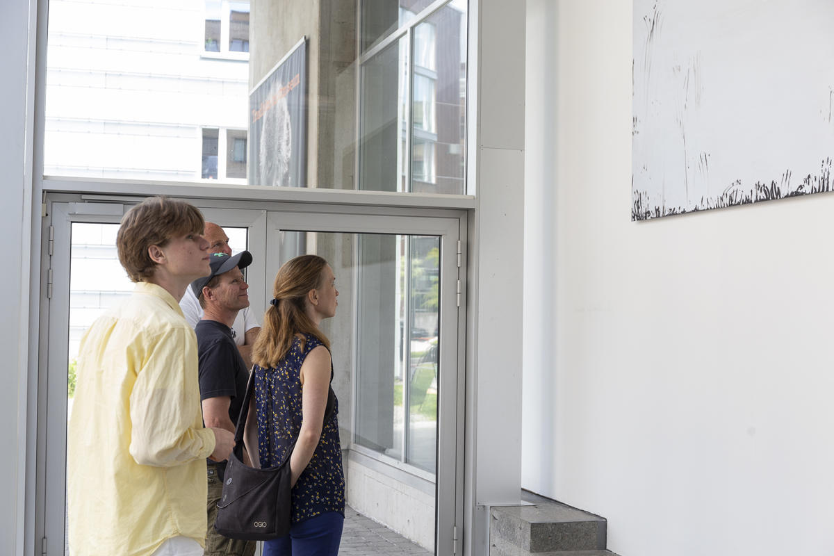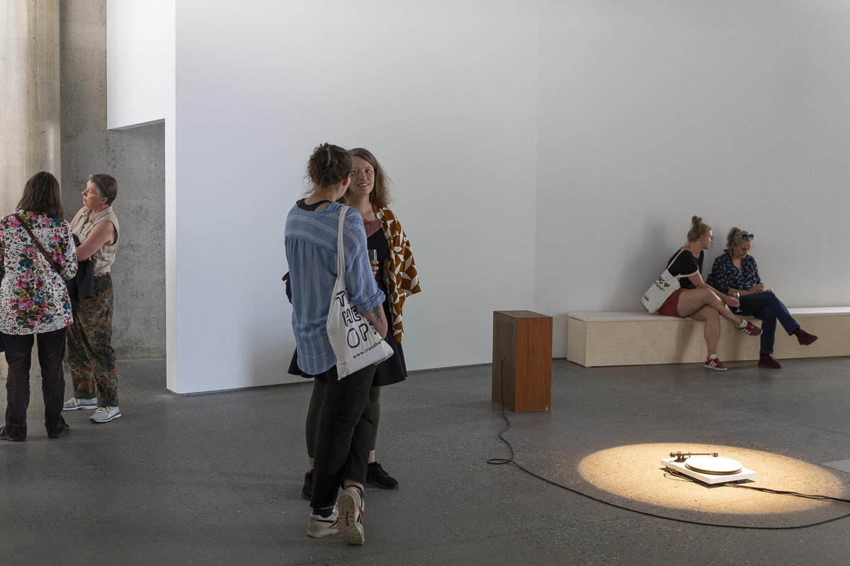 Kurator Randi Thommessen holder omvisning i utstillingen hitting you with snow on my left and right shoulder av A K Dolven på TKM Gråmølna.