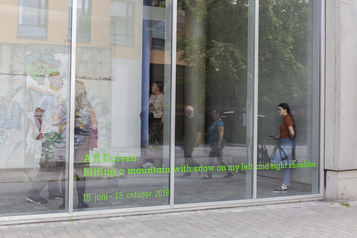I utstillingen på TKM Gråmølna vises maleri, fotografi, video og lydinstallasjoner. Vi er spesielt stolte av å kunne presentere fire helt nye verk, som aldri tidligere har blitt vist. Blant de nye er tittelverket touching you with snow on my left and right shoulder, som er et monumentalt dypsort oljemaleri, hvor hun har brukt sine egne skuldre til å male tre hvite strøk. A K Dolvens visuelle verk er ofte i gråskala eller i sort og hvitt i sterk kontrast. Hun arbeider på en veldig umiddelbar måte, og sier:
