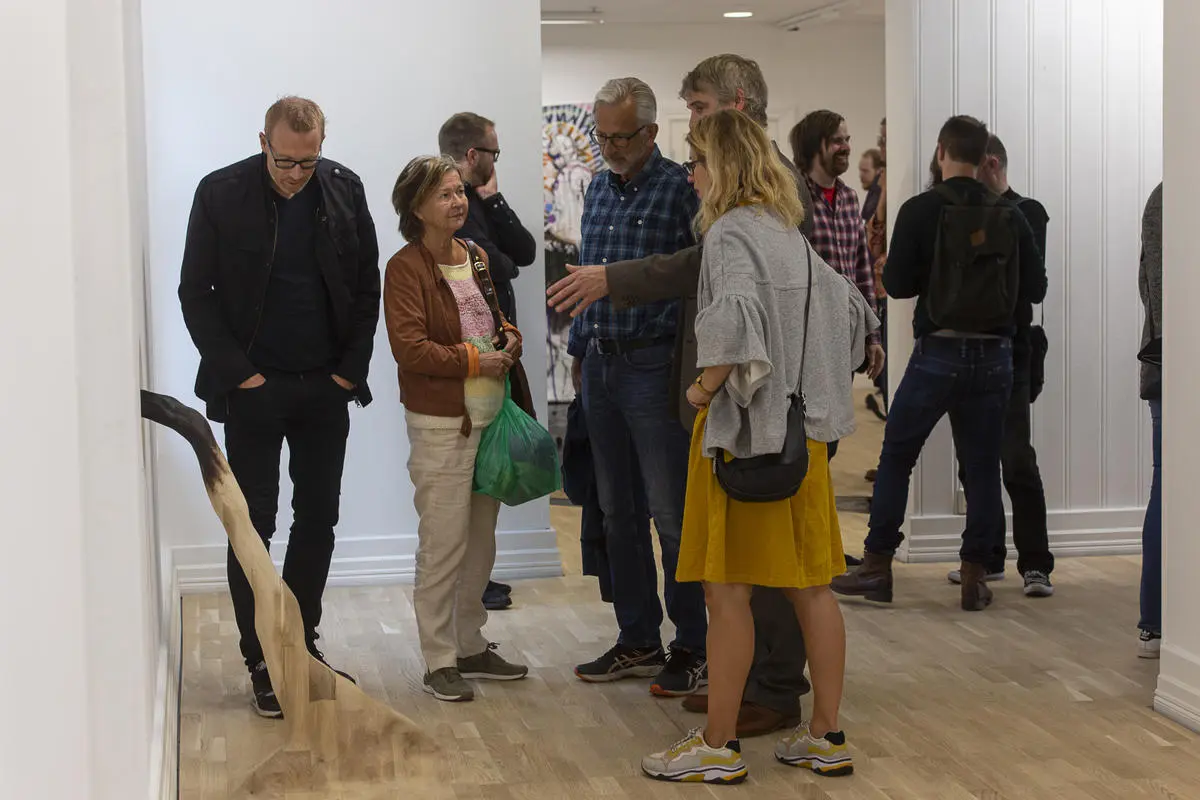 Utstillingen Amdam og Andersen + Håkon Bleken kan sees som en totalinstallasjon. Roald Andersen d.y sine skulpturer og Marius Amdam sine malerier kommer opp og ned av gulvet, og vi blir dratt med inn og ut av relasjoner og roller. Utstillingen er fylt med åpne historier om barndom, familien, hjemmet, byen, kunsten og døden. «Døden, døden, døden», som forfatteren Astrid Lindgren begynte sine telefonsamtaler med, bare for å få det ubehagelige ut av veien og heller snakke om andre ting. Levelige ting. Hverdagslige ting.