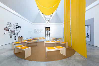 Et teppe, en gruppe modulbaserte møbler, og en baldakin, utgjør arena for en serie