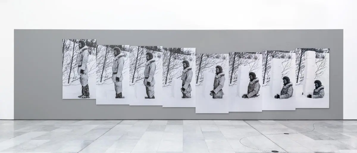 Measuring the Depth of Snow was made in Røros, the winter of 1982. In the series of eight photographs Daren’s body disappears in the ground, as if he was walking down a flight of invisible stairs. He marks the depth of every step by stacking an equivalent cube of snow on top of the snow surface. With an act of absurdity and humor, Daren uses his own body as an instrument of measuring.