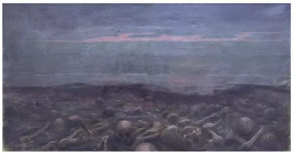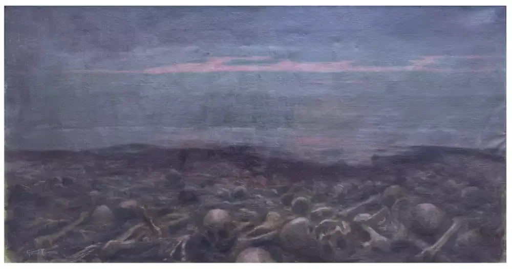 Gabriel Kielland (1871-1960) var både maler og arkitekt, med utdanning fra Trondheim, Hannover og München. Kielland er mest kjent for sitt hovedverk, som faktisk er synlig fra museet - glassmaleriene i Nidarosdomen, inkludert rosevinduet på Vestfronten som fremstiller Dommedag. Den mørke symbolikken er også påfallende i Dødsstranden, maleriet Kielland debuterte med på Høstutstillingen til Trondhjems Kunstforening 1895. På denne tiden oppholdt Kielland seg i München og bildet viser tydelig inspirasjon fra den tyske symbolismen. Kanskje var den et uttrykk for det sene 1800-tallets pessimisme overfor det moderne samfunnets dekadens. Men denne dødens strand er hverken bundet til tid, hendelse eller land.