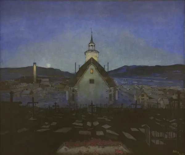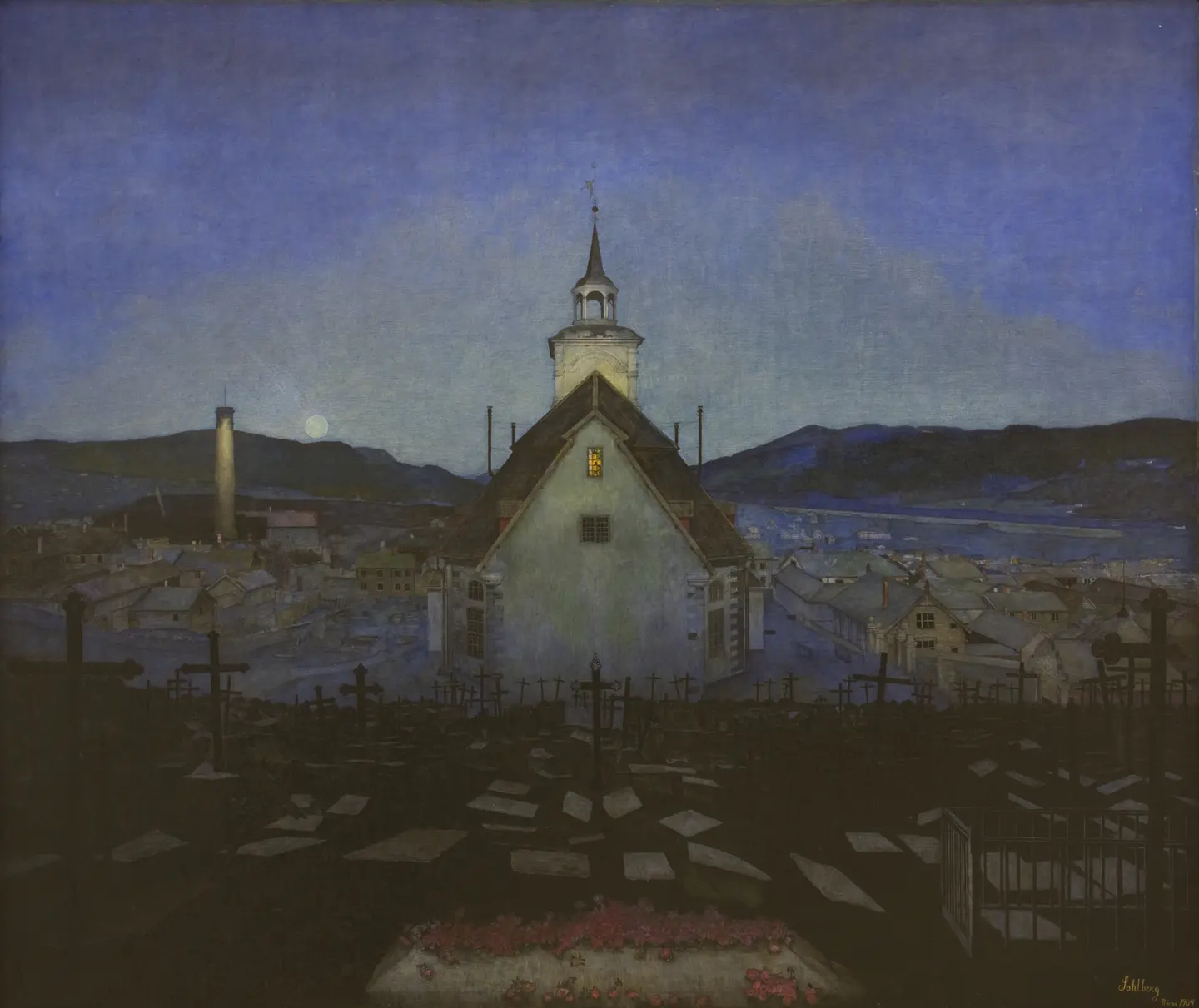 Sohlberg’s depiction of night at Røros have captivated and spellbound ever since. Solemn, monumental, and intense with a carefully tuned palette and a mystical shine. Beneath the deep blue sky with hints of violet and green, the night has fallen on the slumbering town and the churchyard. Here is light and dark, life and evanescence in a rare, thought provoking unity.