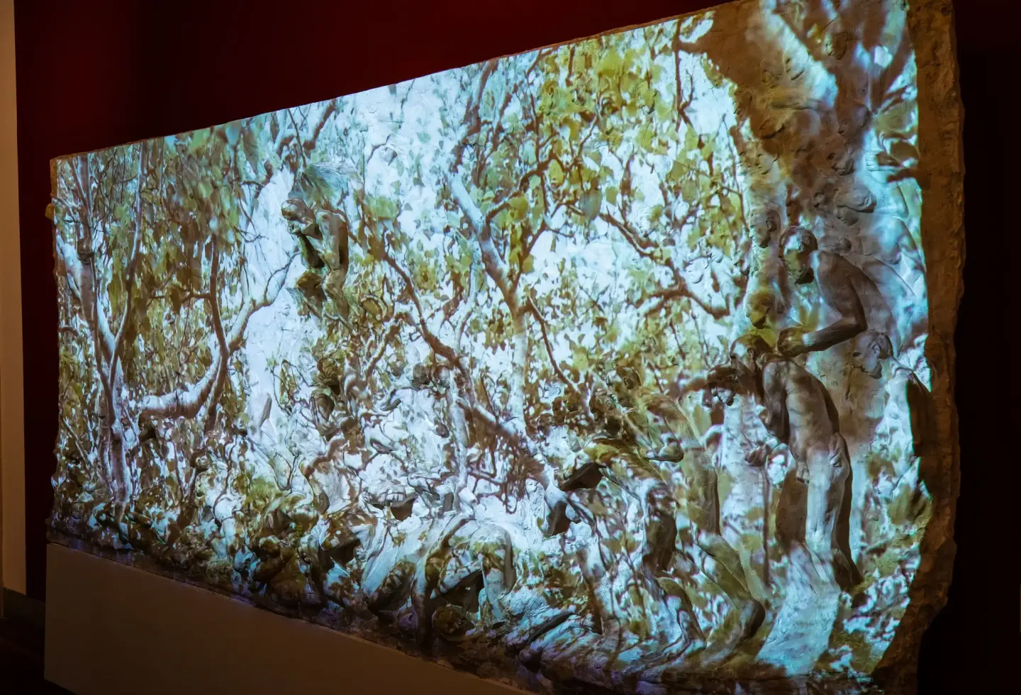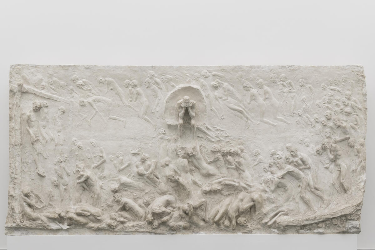 Goldberg made the film to be projected over Gustav Vigeland's Hell. Goldberg's projection and Vigeland's relief are shown alternately. Gustav Vigeland called the relief Hell, and he referred to the man enthroned in the middle as Satan. As early as 1894, Vigeland showed this plaster version of the motif at his first solo exhibition at Christiania Kunstforening.