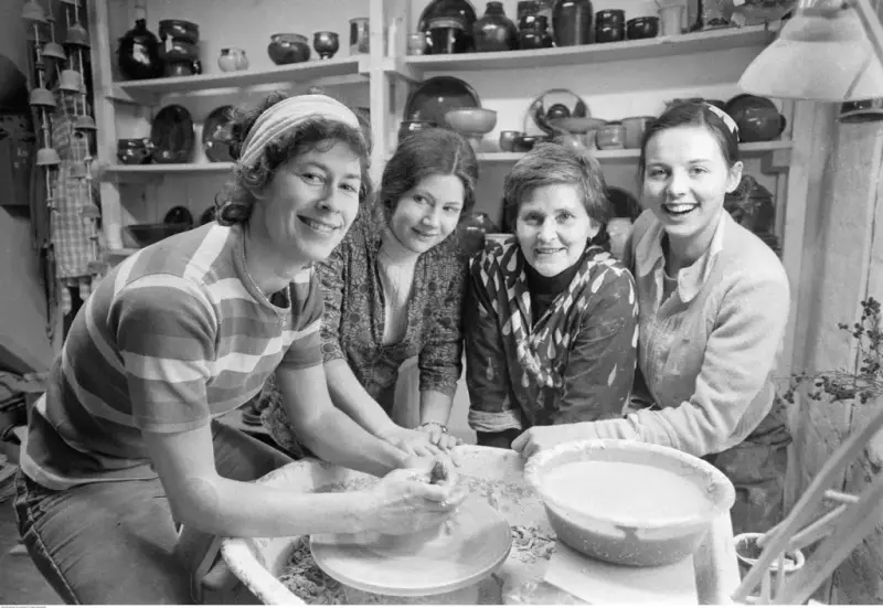 Lisbet Dæhlin at her studio in Frysja Art Center. From left to right: Lillian Magnus, Anne Hansen, Lisbet Dæhlin og Jannicke Heierdahl-Larsen. February 1975. Courtesy Arbeiderbladet/The Norwegian Labor Movement Archives and Library