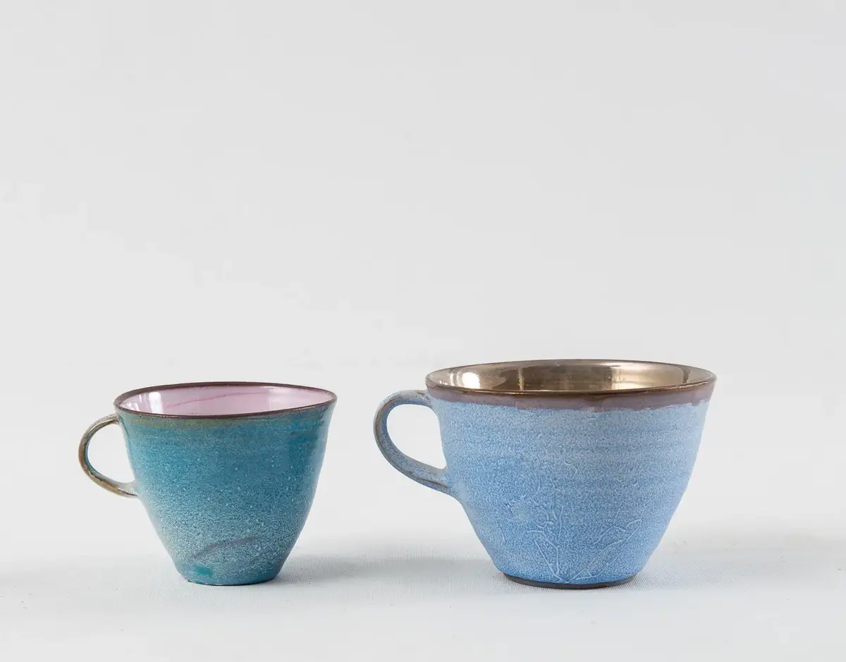 Dæhlin has been described by her colleagues as both quiet and modest, but also brave and strict. She was groundbreaking in that she employed a strong blue, matt glaze and increased the size of the object, moving towards the sculptural. She also took up the idea of adding luster, gold, onto cups and vessels, which wasn’t fashionable at the time. Dæhlin herself said of her rebellious “gold” period: “I grew up with the pure form of the 40s and 50s, and an architectural style where decoration and flowers were inexorably stripped away. That’s still my style. But sometimes I break with the purist in me and use gold on the edge of the cup.”[2] One of those golden cups, used daily by her granddaughter, artist Maritea Dæhlin, for a morning coffee, will become a sculpture for the exhibition period.
