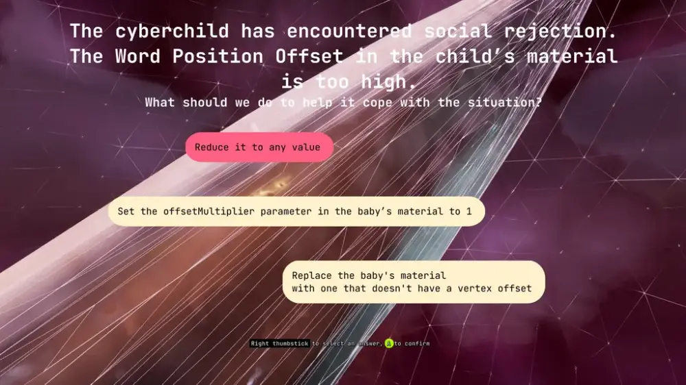 Mother*hood Instruction introduces a cyber environment for the emergence of a cyber child — an artistic embodiment of the shared response-ability of motherhood. Structured like an interactive game, the sound performance/sound work can only progress when the basic needs of the cyber child are met. In order to perform the actions required to care for the cyber child, the viewer/player has to understand the cyber child’s needs. When the viewer/player hears the call, they have to decide whether to answer it, wait, or ignore it. The viewer/player will soon discover that answering the cyber child’s needs will be challenging; these needs are embedded in the game’s code, so one must understand the underlying logic to satisfy the cyber baby’s needs. Regardless of the answer, making a decision (selecting one of the alternatives offered in the game) moves forward the narrative of the sound performance.