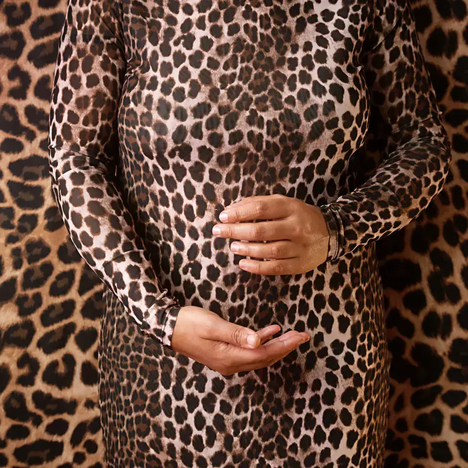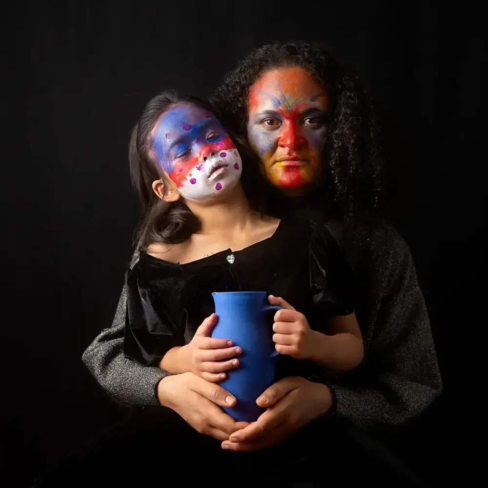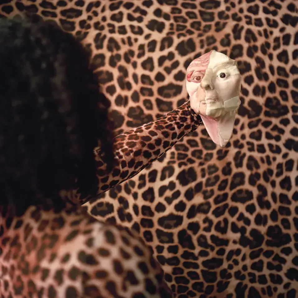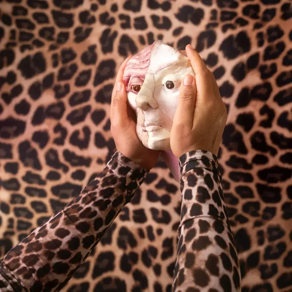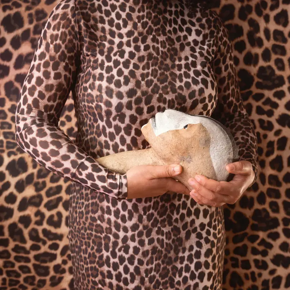 The photographs shown in Passing Motherhood, including Great Grandmother’s Dance, depict Dæhlin with her daughter Nina, both with painted faces, holding one of her grandmother/great-grandmother’s signature blue jugs. The face painting occupies a liminal space between children’s play and ritual masking; an echo of Gitte Dæhlin’s sculptures in which faces often appear as mask-like forms. Other photographs show Maritea wearing a leopard print, posing with various objects from her mother and grandmother’s bodies of work: papier-mâché and textile sculptures, as well as ceramics, including a gold cup that Dæhlin uses daily. The leopard pattern is omnipresent, challenges the viewer, and can be interpreted both as a superficial consumer product and an animal mask. It is a transgression of human and animal boundaries that echoes something similar in Gitte Dæhlin’s sculptures, and it is a recurring theme in Maritea’s work.