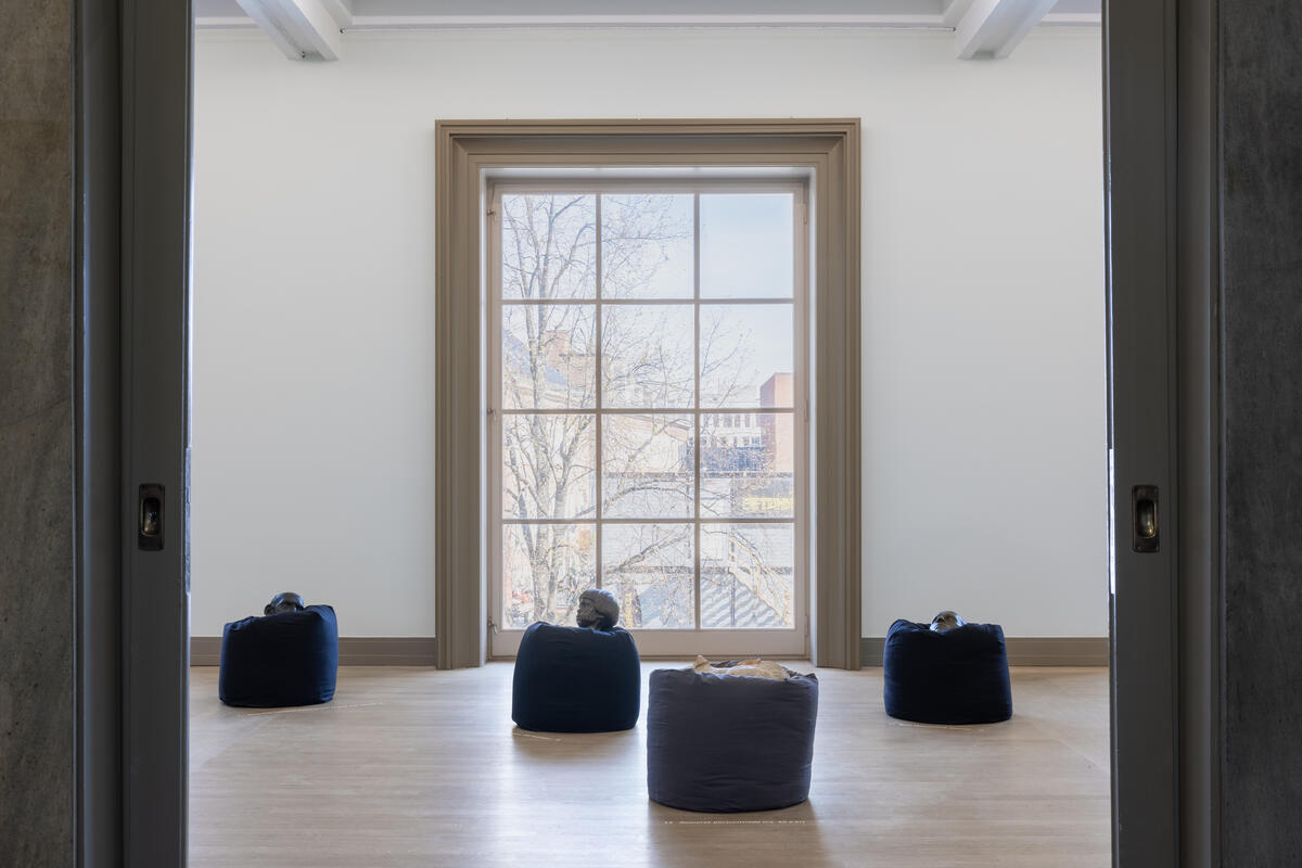 To Make it Soft is an exhibition that plays with ways of displaying art in what is known commonly as the Sculpture Hall at Trondheim kunstmuseum. The hall got its name simply because it was where the sculptures in the collection were displayed. Sculptures were often placed on high pedestals, in a row, preferably close to the walls. Much has changed since then. In anticipation of the new presentation of the museum's collection, opening in autumn of 2023, we have once again created an exhibition of sculptures in this hall. This time around, they are not placed upon pedestals. Instead, they are laid down on soft bases.