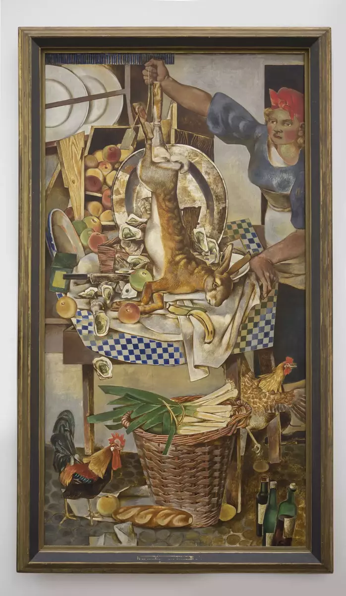 Maleriet viser en tilsynelatende kaotisk scene fra et kjøkken. Rundt og på bordet foregår et virvar av oppdekning, servise, frukt, østers, bananer og to flaksende haner. Sentralt i motivet er den opphengte haren, som holdes oppe av kjøkkenpiken. I den knyttede hånden, bordflaten og i den rutete duken aner vi det underliggende matematiske skjelettet i bildet, som viser at kaoset har en nøye utregnet orden.