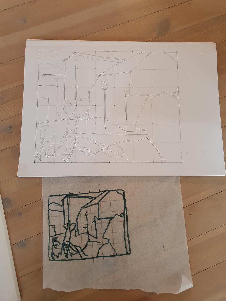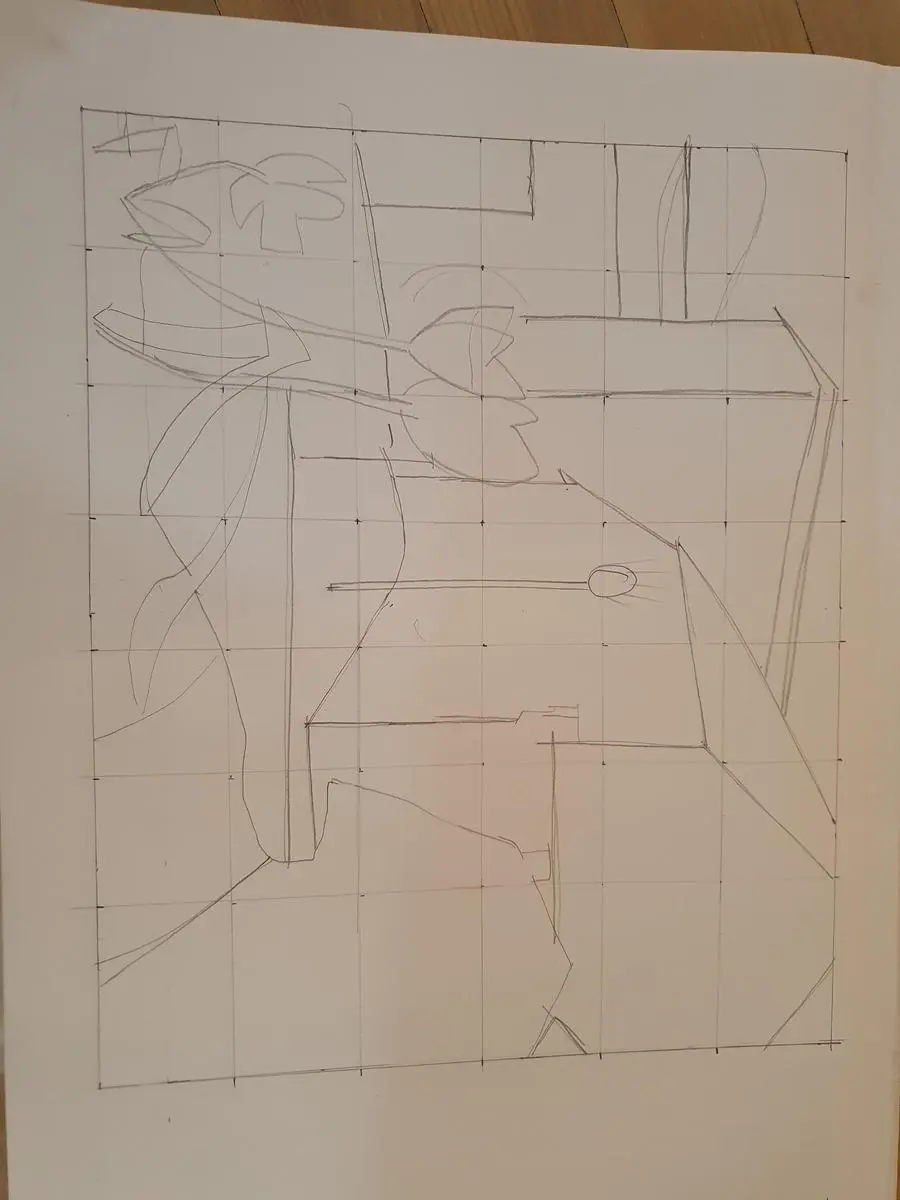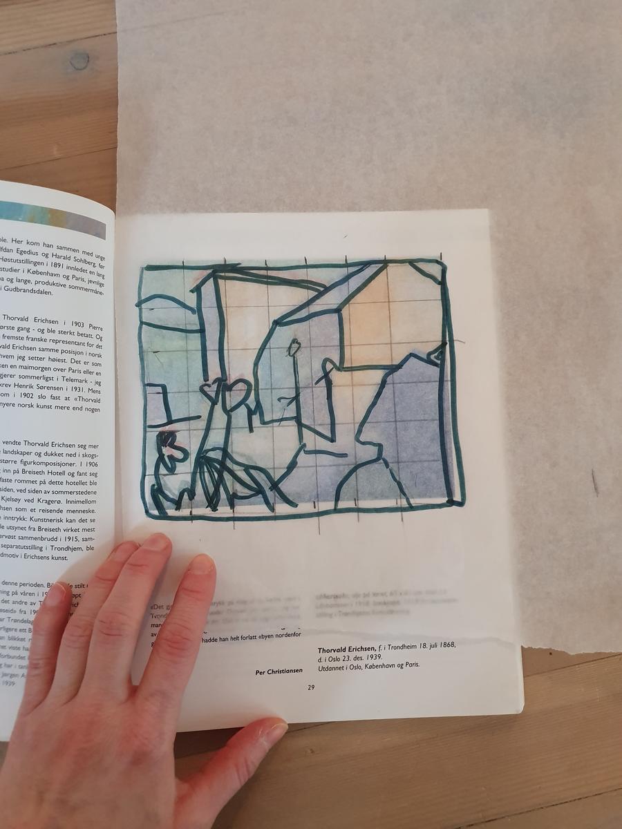 Finn noe du har lyst å kopiere. Du kan søke i over 1000 kunstverk fra Trondheim kunstmuseums samling på DigitaltMuseum - kanskje finner du noe der? Legg arket over bildet du vil kopiere. Matpapir er veldig gjennomsiktig. Tegn svakt konturene til motivet. Om du ikke kan legge arket over, eller har lyst å forstørre det skal kopiere, lager du rutenett og hjelpelinjer.