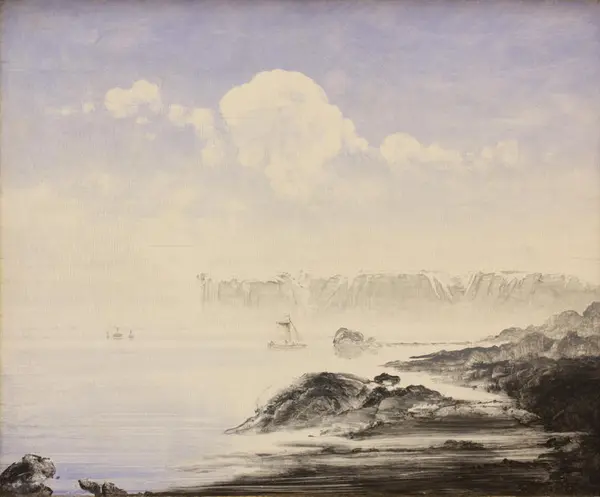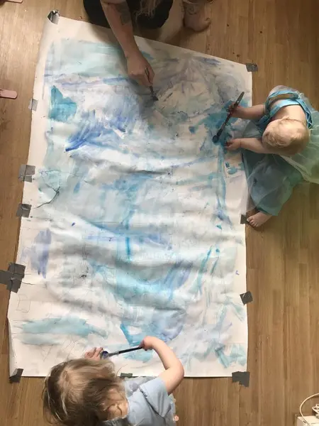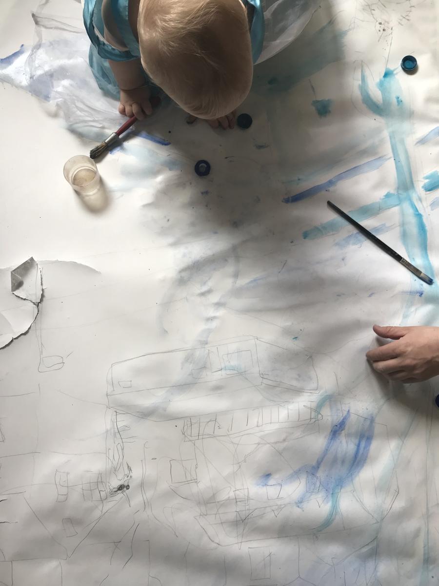 Inspirert av Peder Balke sitt maleri Nordkapp, fra ca 1870, har vi malt det vi ser ut av vinduet, i blåtoner.