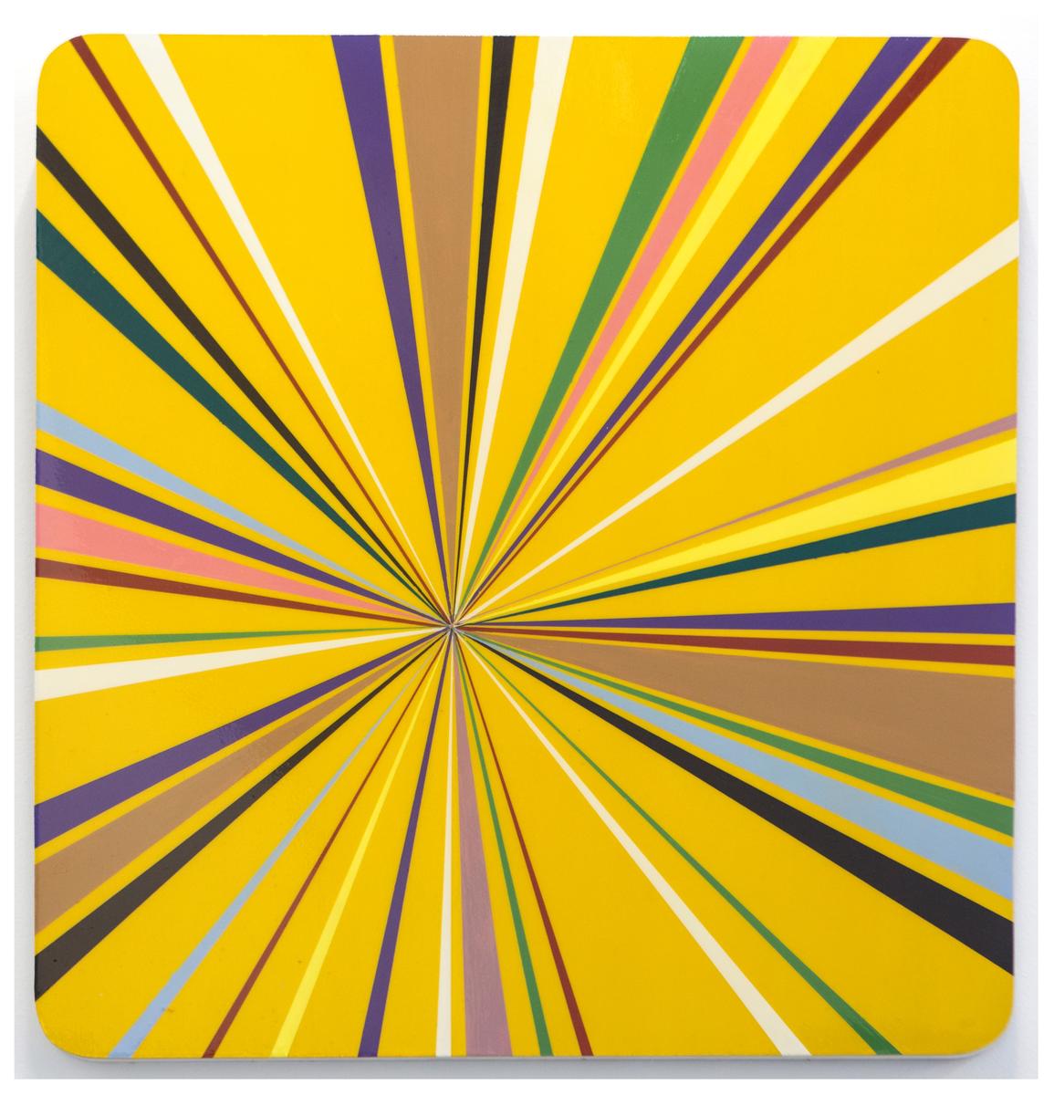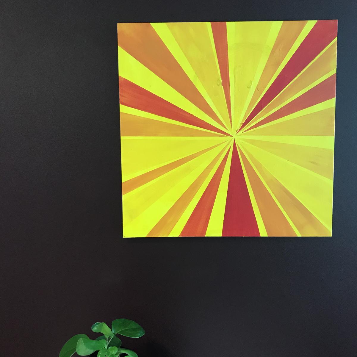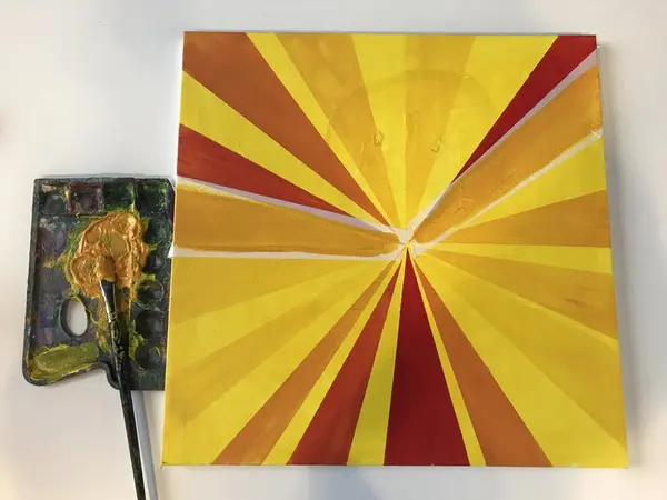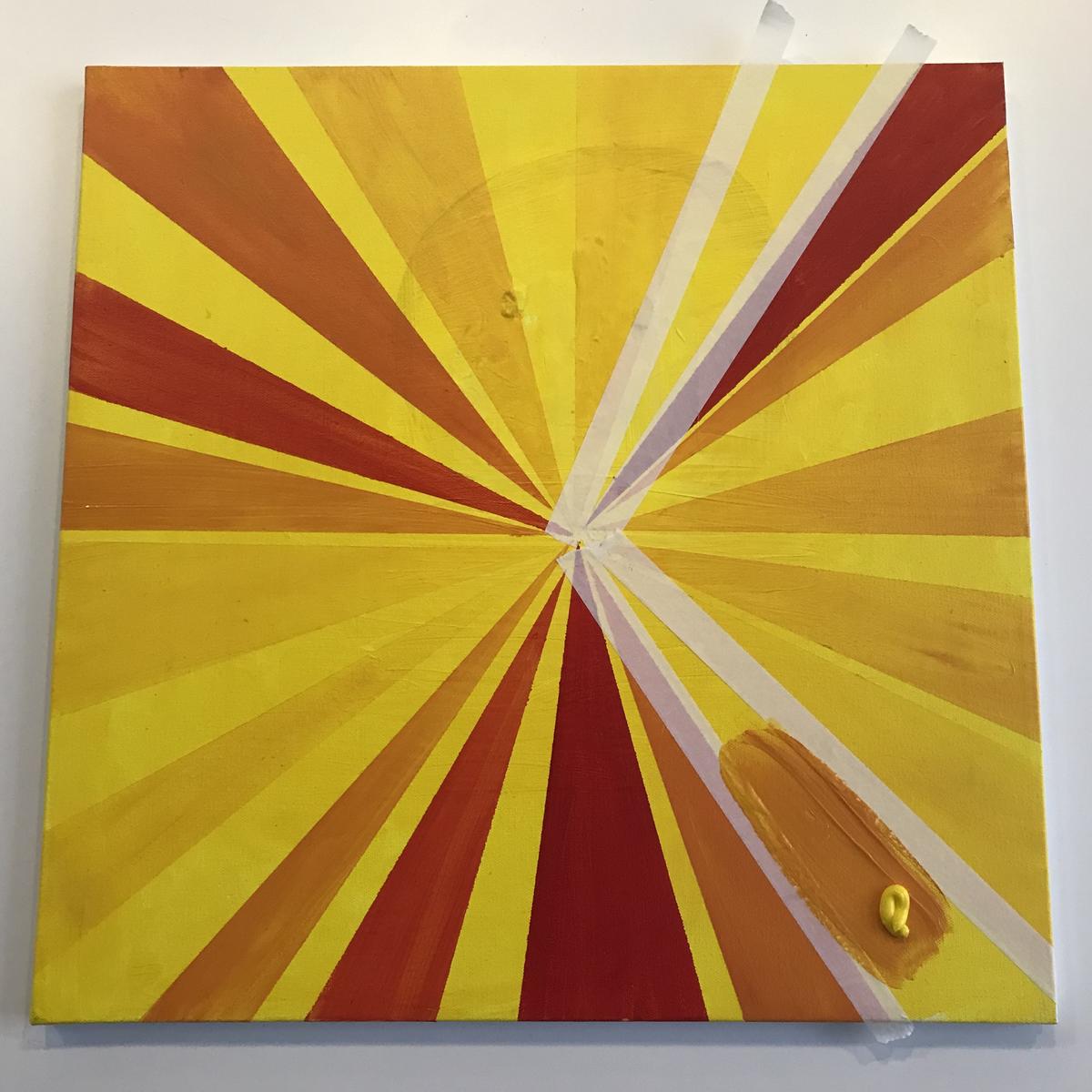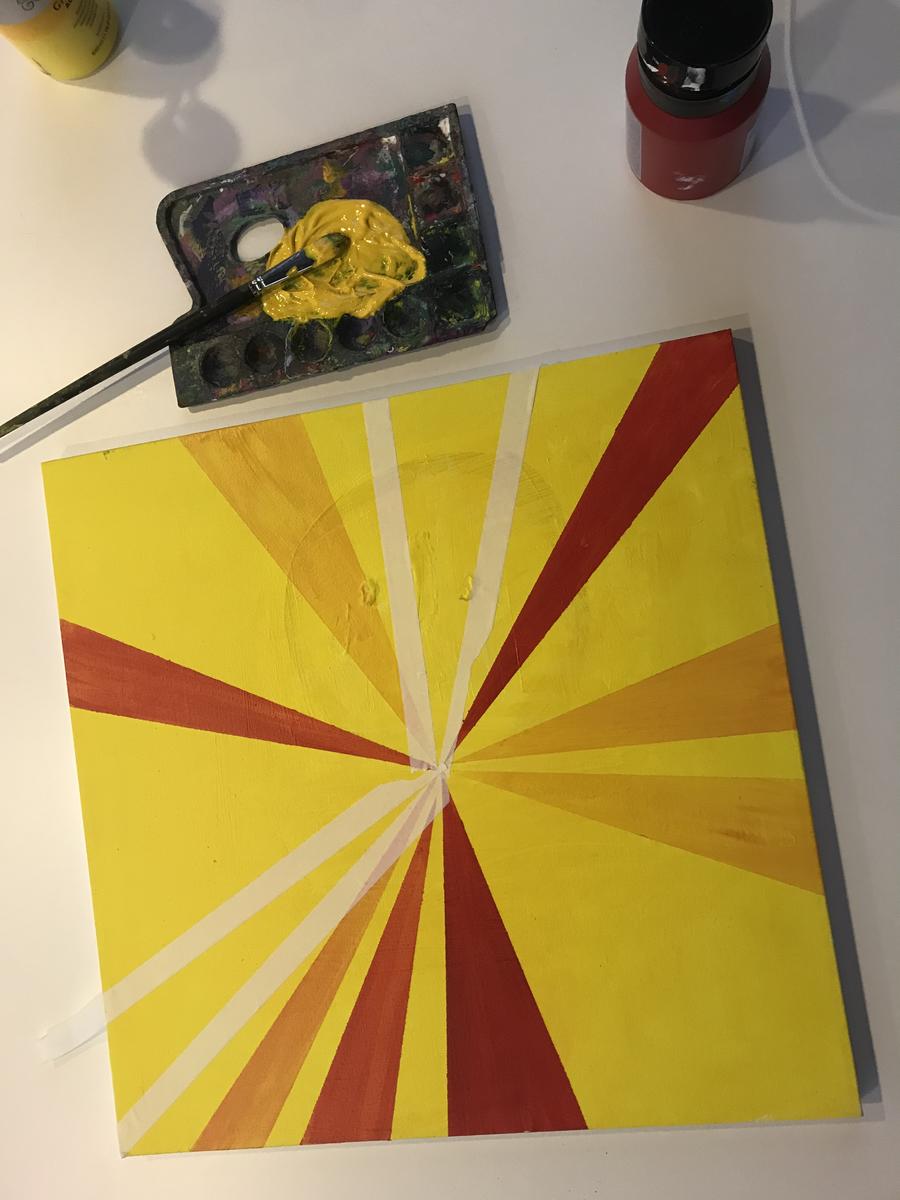 Først maler du lerretet gult. Så teiper du opp de første avlange trekantformene, jeg laget to av gangen. Bland litt rødt i gulmalingen og maler de første feltene. Så er det å la feltene tørke. Når det har tørket drar du teipen av.