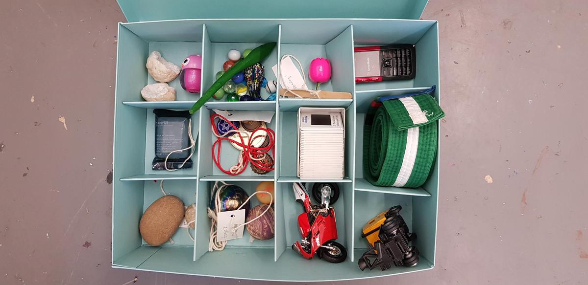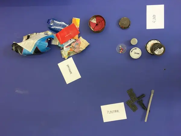 Nå er det på tide å lage utstilling! Plasser gjenstandene i det ulike grupperingene utover et bord, en benk, eller lignende. Legg lappene med kategorier ved siden av. Hvordan kan dere best vise frem samlingen(e) deres?