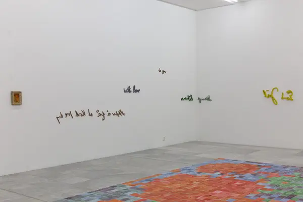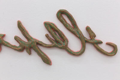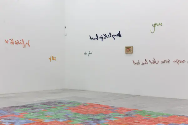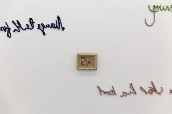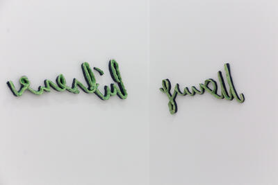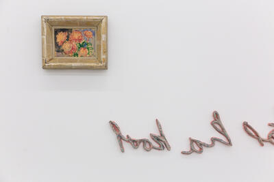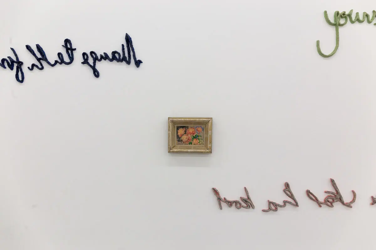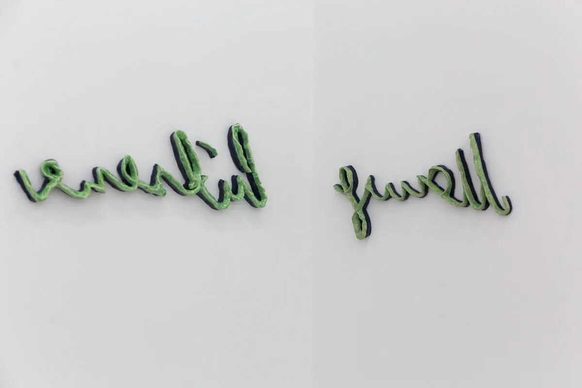 Flowers are painted on the front and, on the back a message is written backwards. His text becomes image and the flowers are already visual.