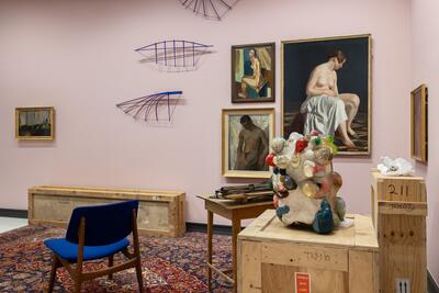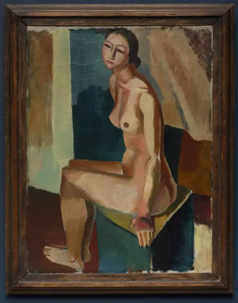 Kvinneakt (1925) viser en sittende kvinne malt i dempet, harmonisk koloritt. Komposisjonen er bygget opp av store fargeflater der den blå bakgrunnen balanseres mot kvinnens gyllenbrune hudtone, og kontrasten mellom dem gir inntrykk av rom og dybde.
