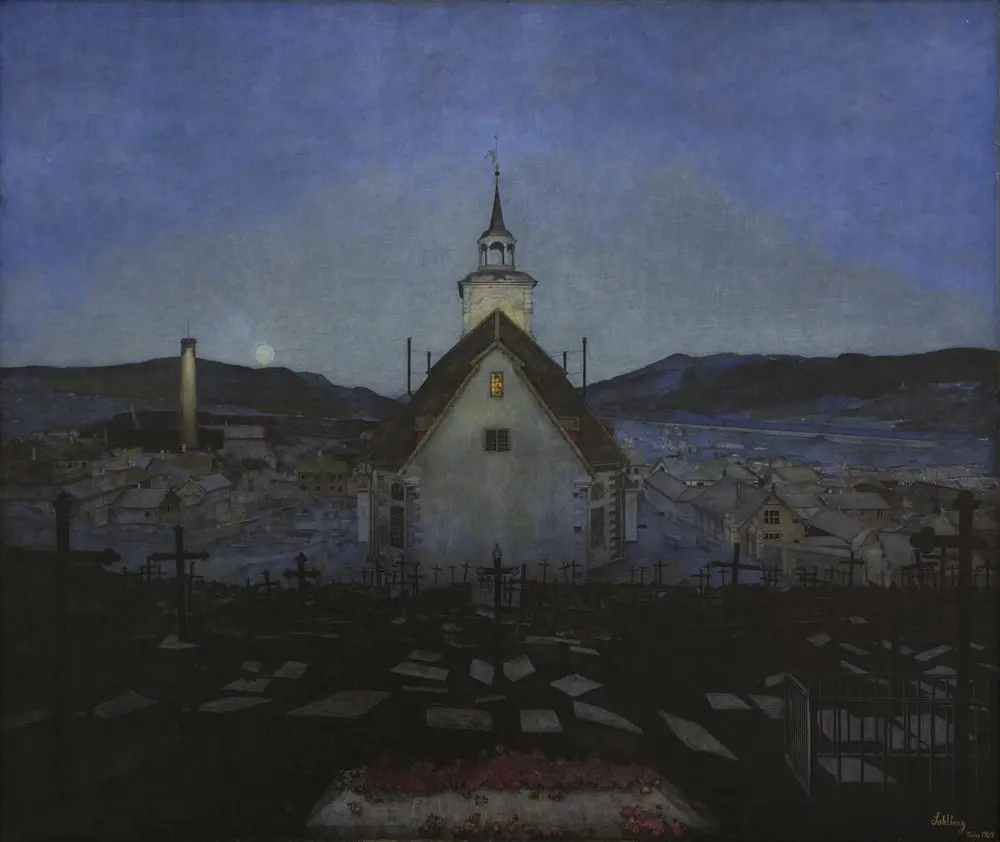 Sohlbergs nattskildring fra Røros har grepet og betatt i alle år siden. Strengt, monumentalt og intenst med en finstemt koloritt og et mystisk skjær. Under den dypblå himmelen med det fiolette og grønne fargespillet har natten senket seg over den slumrende byen og kirkegården. Her er lys og mørke, liv og forgjengelighet i en sjelden, tankevekkende forening.