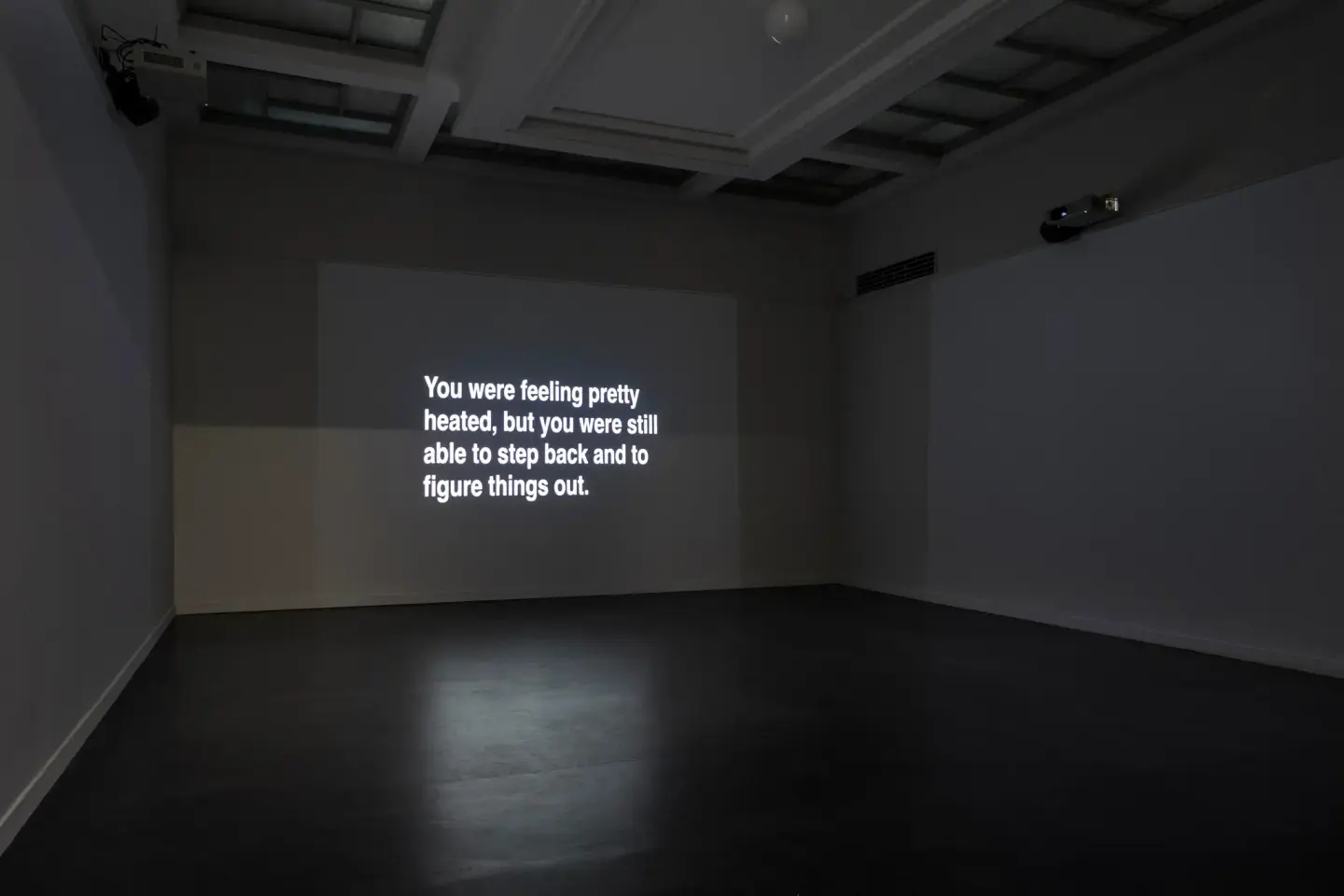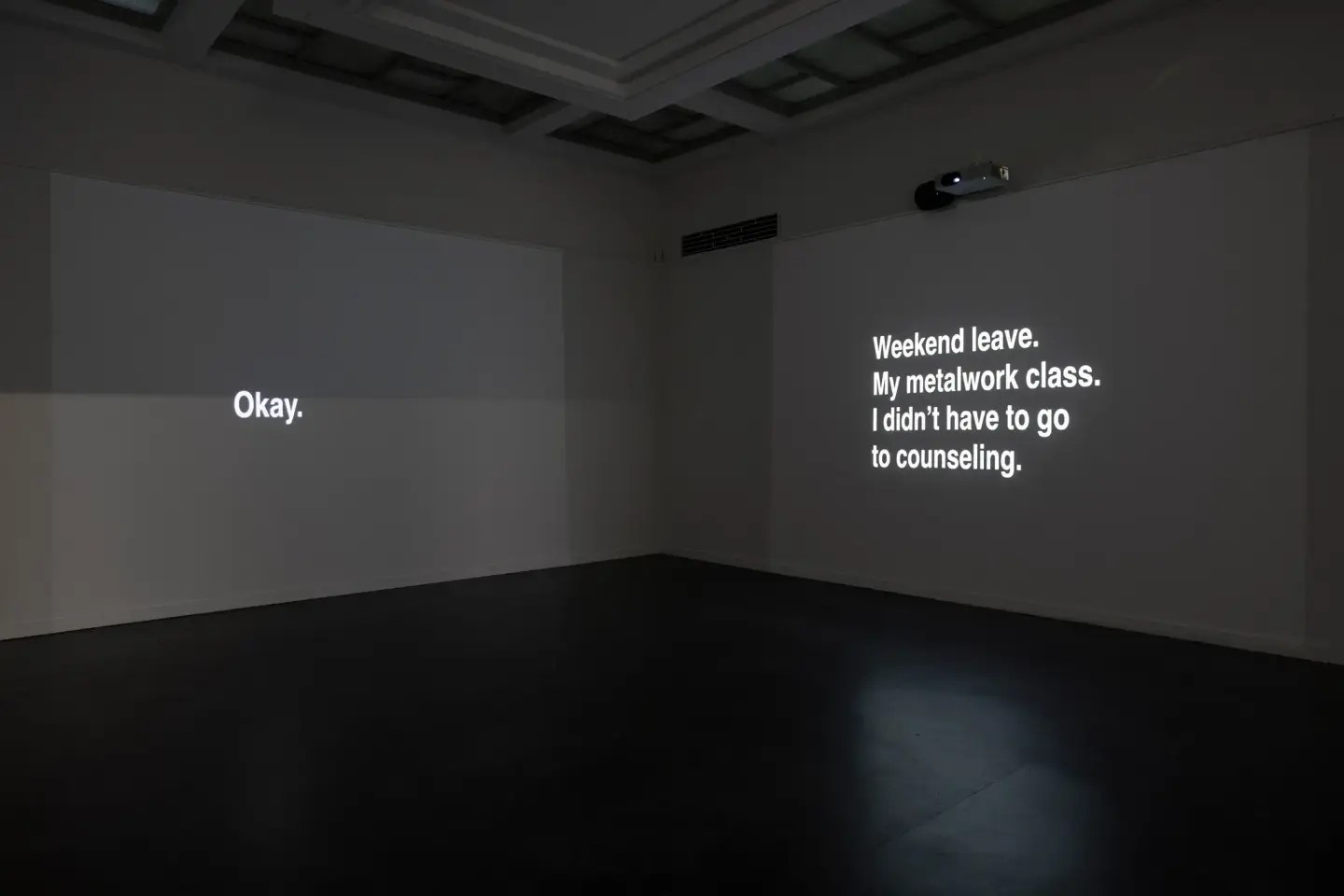 Narrative With an Unexpected Outcome (2011) av Ignas Krunglevičius er en 3-kanals videoinstallasjon som skildrer en dialog fra en gruppeterapisesjon, presentert som animert tekst. Hver skjerm representerer en av deltakerne i samtalen. Denne fremstillingen er en del av en terapiform utviklet på 1970- og 1980-tallet av den australske terapeuten Michael White og hans kollega fra New Zealand, David Epson. Deres tilnærming bruker fortelling som et sentralt element i terapeutiske samtaler. I den aktuelle økten som vises i verket, er en ung tenåringsgutt hovedpersonen.