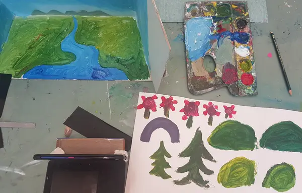 - Mal noen grantrær og blomster i ulike størrelser på et ark. I tillegg trenger du kanskje noen hauger i ulik farge og størrelse. Kanskje du vil sette inn ei bru eller andre ting i boksen også?