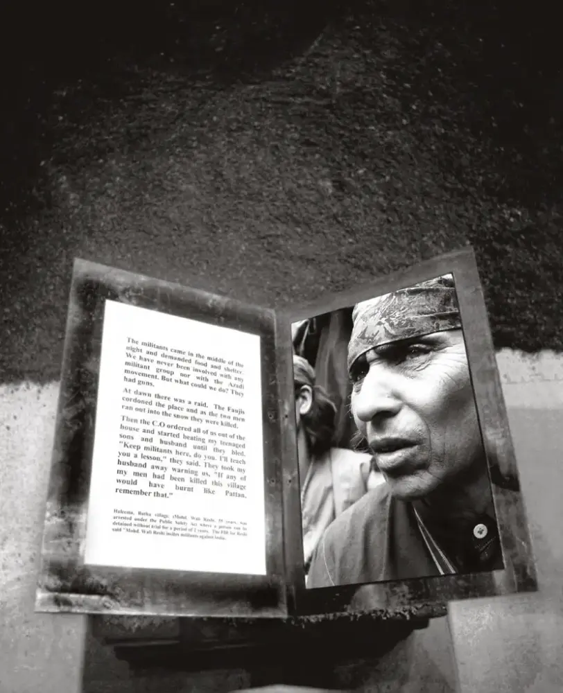 Sheba Chhachhi og Sonia Jabbar, “When the gun is raised, dialogue stops...”: Women's Voices from the Kashmir Valley. Detalj fra Chennai Photo Biennale, Chennai, India, 2019. Courtesy Sheba Chhachhi. Foto: Varun Gupta - 2/2