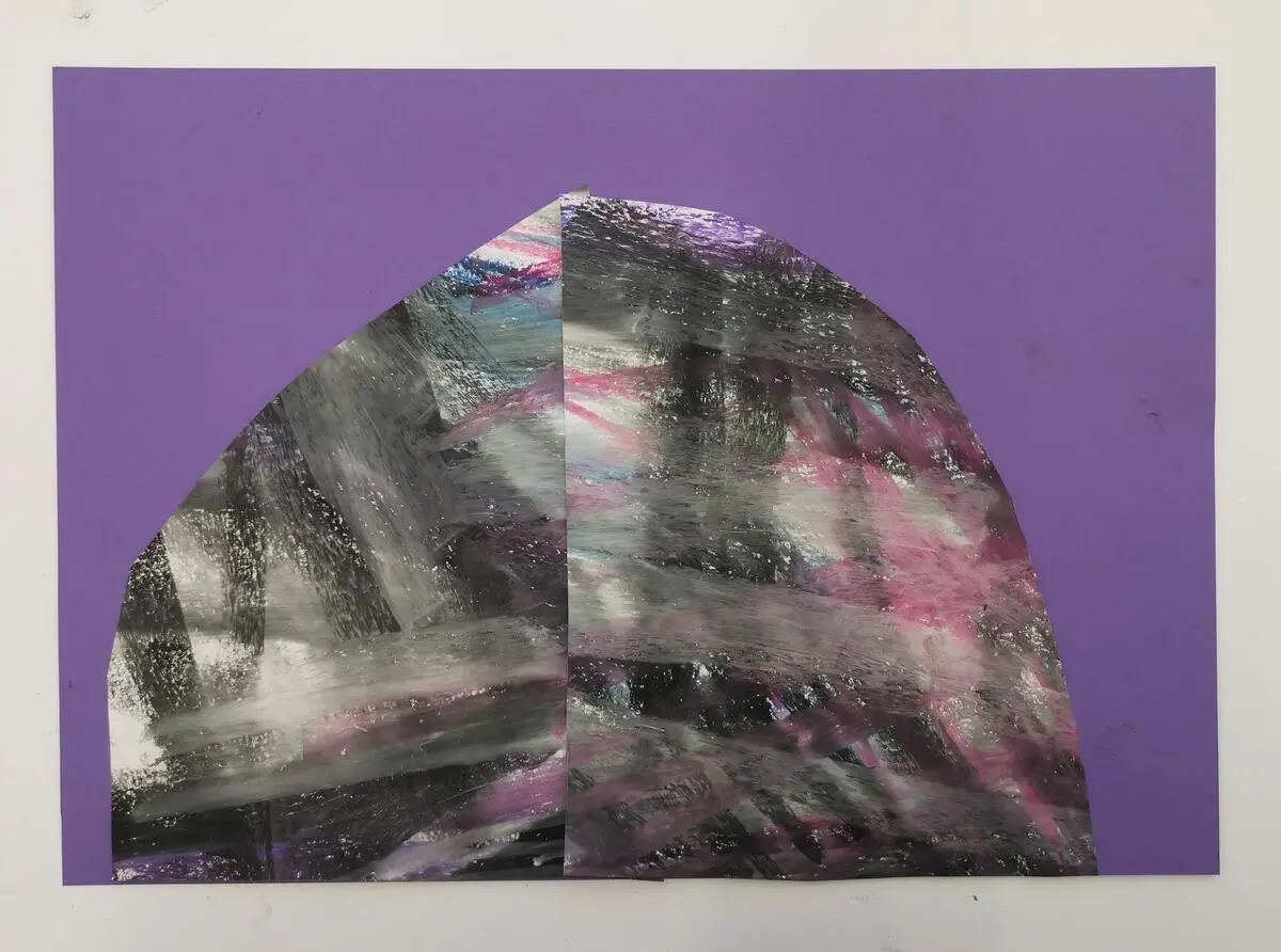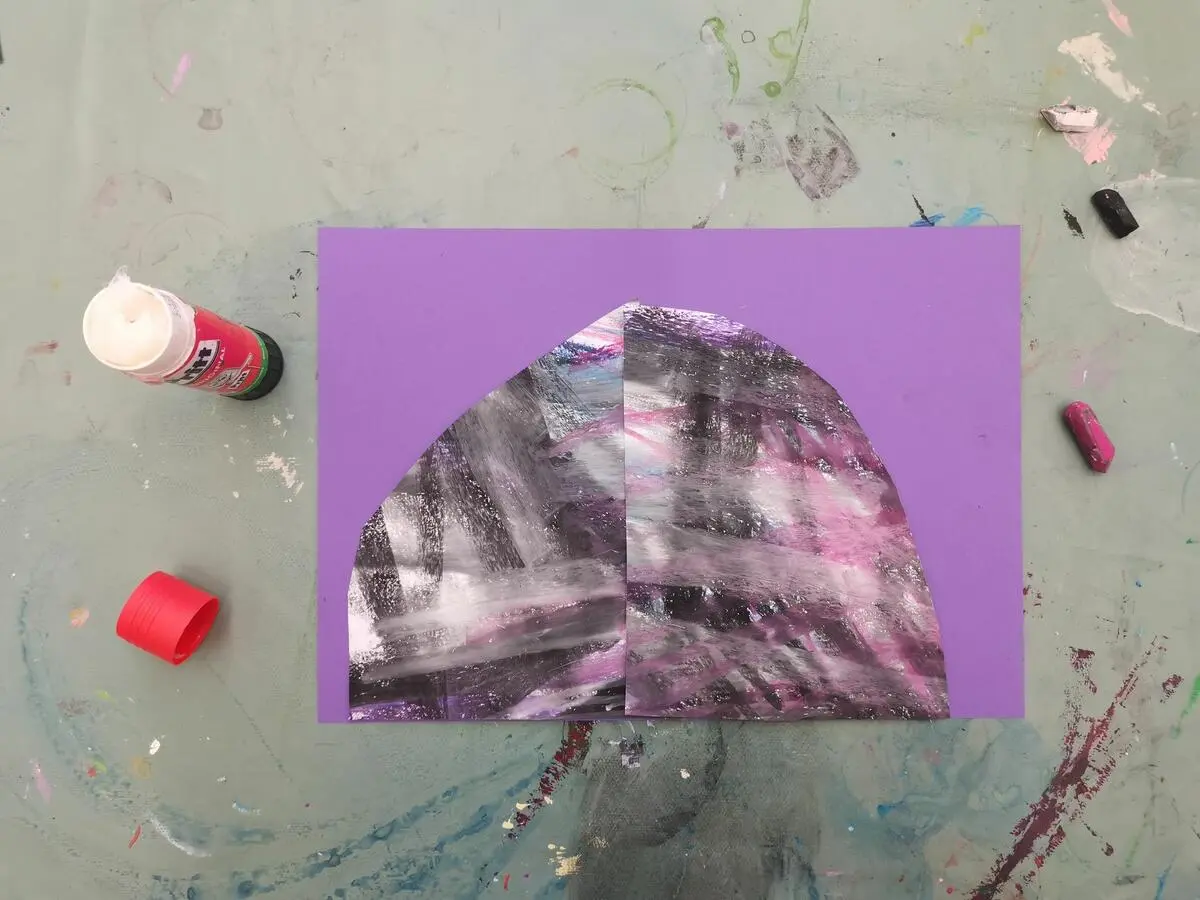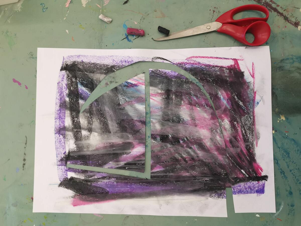 1. Når hele arket er dekt med streker og farger, kan du klippe ut en enkel “fjellform” og lime det på et farget ark. Ble det et fjell som danser?