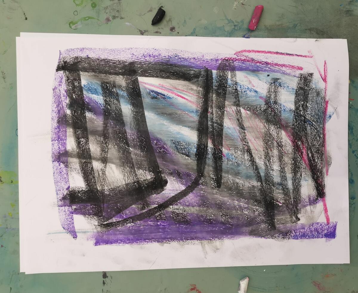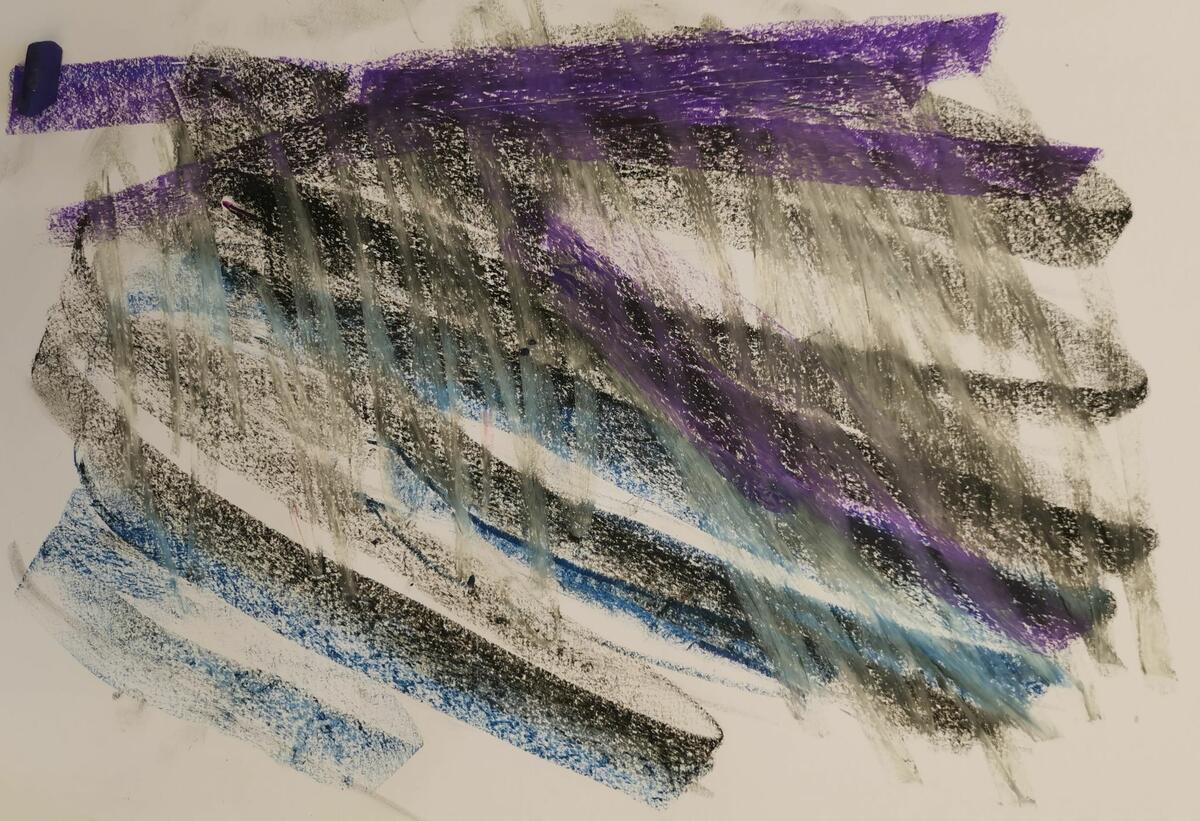 1. Finn et ark, og velg deg ut noen oljekritt eller fettstiftfarger som du synes passer sammen. Nå skal du fylle ut arket med streker. Forsøk å bruke krittet på så mange måter som mulig. Du kan for eksempel legge krittet med langsiden ned mot arket, eller lage raske rette streker med mye fart. Forsøk å fylle arket.