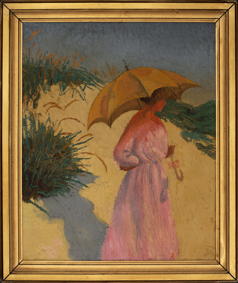 Om du ser på skyggen din, ser den kanskje litt grå ut, men ser du hvilken farge Hannah Ryggen har brukt til å male skyggen i maleriet? Den ser nesten blå eller fiolett ut, som er i kontrast til det gule og oransje sollyset. Ser du også hvordan kjolen har flere ulike farger og at fargen blir kaldere på baksiden? Det er for å vise hvor lyset treffer og ikke. Vi kaller skyggen som faller bak deg for slagskygge, mens skyggen som er på en gjenstand, slik som kjolen i bildet, kaller vi egenskygge. Et sted hvor Hannah Ryggen ikke har brukt en kald farge er under parasollen. Der ser skyggen nesten oransje og rød ut, hvorfor det tror du? Er det fordi det veldig varmt under parasollen?