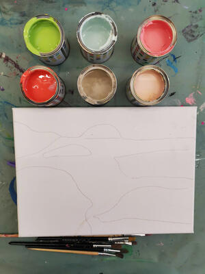 Hva du ønsker å male i denne oppgaven er opp til deg, men det som vi skal forsøke å gjøre er å få fargen i det første laget til å lyse igjennom det andre laget. Det kan være en fordel å ha sterke og varme (for eksempel rød, gul eller rosa) farger som første lag og kjøligere farger (for eksempel blå, grønn eller hvit) i andre lag. I tillegg blander vi inn bakepulver i malingen slik at den blir tykkere i lag to og at vi får bedre effekt av skrapingen.