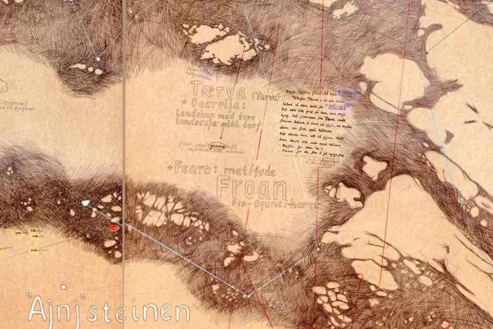 Noerte Miere fulkieh (Nordkystens samarbeidsområde), detalj av tegning, Sissel M. Bergh 2017-2020, Trondheim Kunstmuseums samling